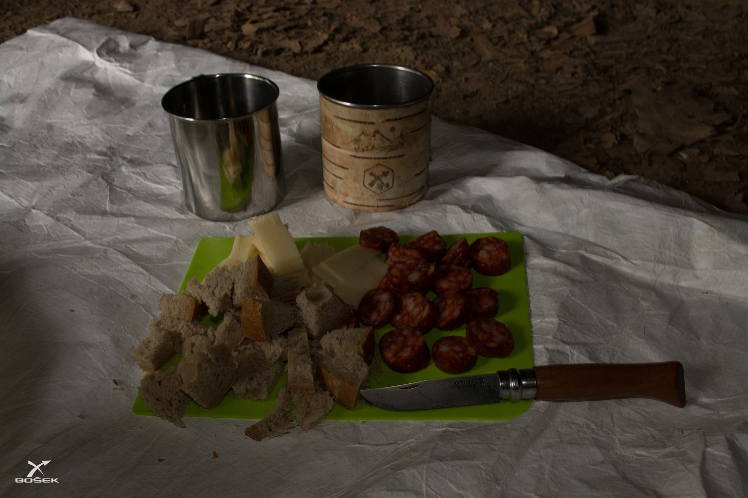 Chtěl jsem původně dělat ohýnek a péct buřty, Janča nám taky chtěla uvařit Katův šleh z Expres Menu. Na teplou večeři i oheň jsem se sice moc těšil, ale ukecal jsem ji, že nic z toho dneska už dělat nebudeme. Že si jen nakrájíme a sdlábneme sýr a klobásu (pak jsem přikrájel ještě toho studenýho buřta) a pro dnešek to definitivně zabalíme. Já jsem toho měl fakt plný brejle a ona se to samé snažila neúspěšně maskovat za úsměv.