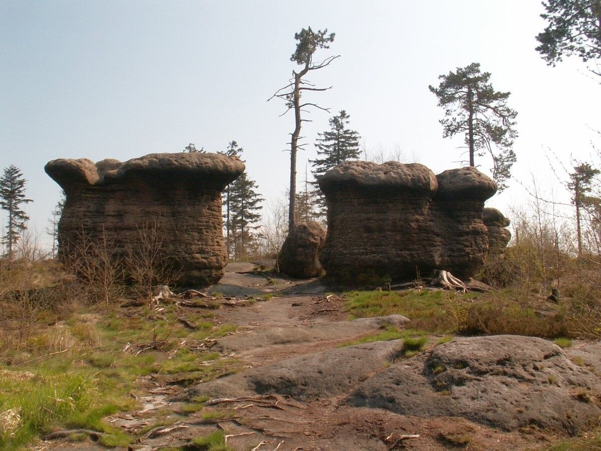 Po dvou stech metrech jsme tu, Kamenné hřiby. Koukal jsem na mapách na fotku z roku 2008. To musela bejt paráda, když kolem byla mýtina.